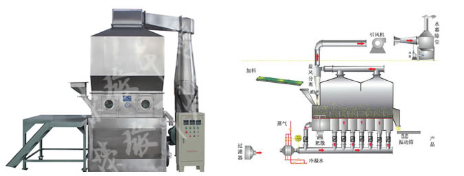 散粒狀固體物料由加料器加入流化床干燥器中,過濾后的潔凈空氣加熱后由鼓風(fēng)機(jī)送入流化床底部經(jīng)分布板與固體物料接觸,形成流態(tài)化達(dá)到氣固的熱質(zhì)交換。物料干燥后由排料口排出,廢氣由沸騰床頂部排出經(jīng)旋風(fēng)除塵器組和布袋除塵器回收固體粉料后排空。